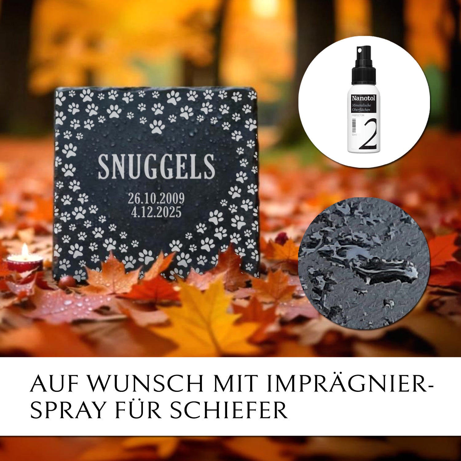 Grabstein für Hunde und Katzen als liebevolles Andenken an Ihr verstorbenes Haustier. Hergestellt aus robustem Schiefer, einschließlich Gravur eines Pfoten-Herz sowie individueller Beschriftung.