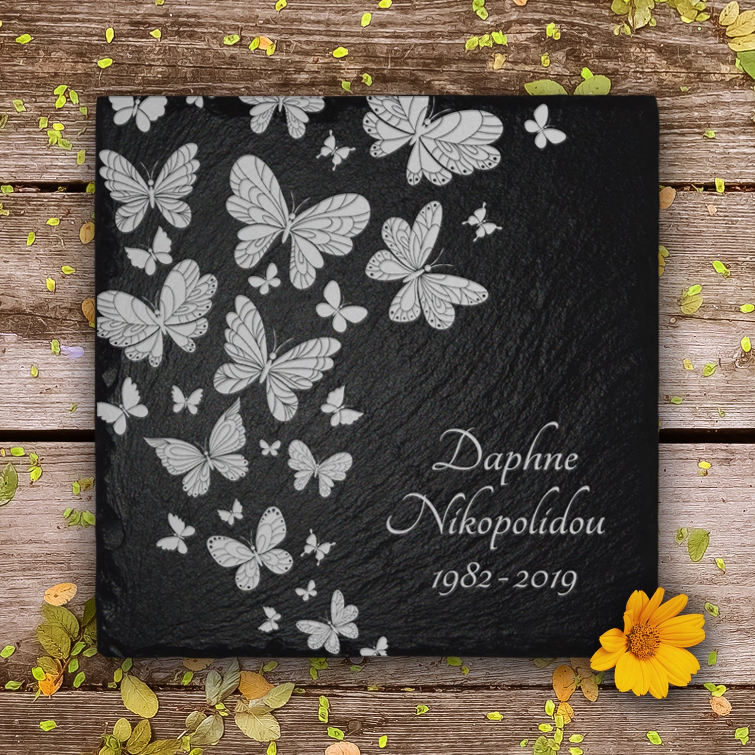 Kleiner Grabstein aus Schiefer inkl. Schmetterlinge Gravur & Beschriftung nach Wunsch.