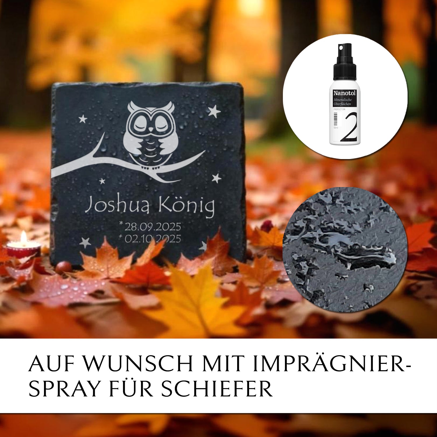 Kleine Grabtafel als liebevolles Andenken an Ihr Sternenkind. Handgefertigt aus natĂŒrlichem Schiefer mit kleiner Eule Gravur und persönlicher Beschriftung.