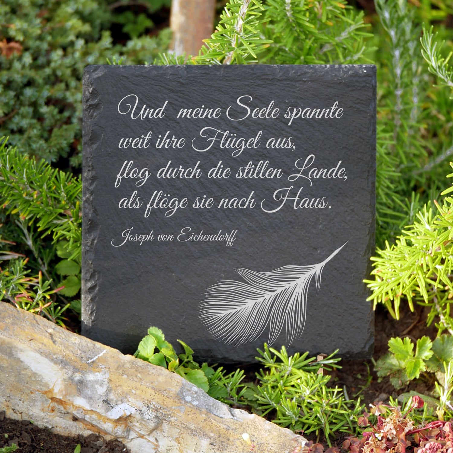 Grabschmuck aus Schiefer mit liebevoller Feder Gravur und Trauerspruch.