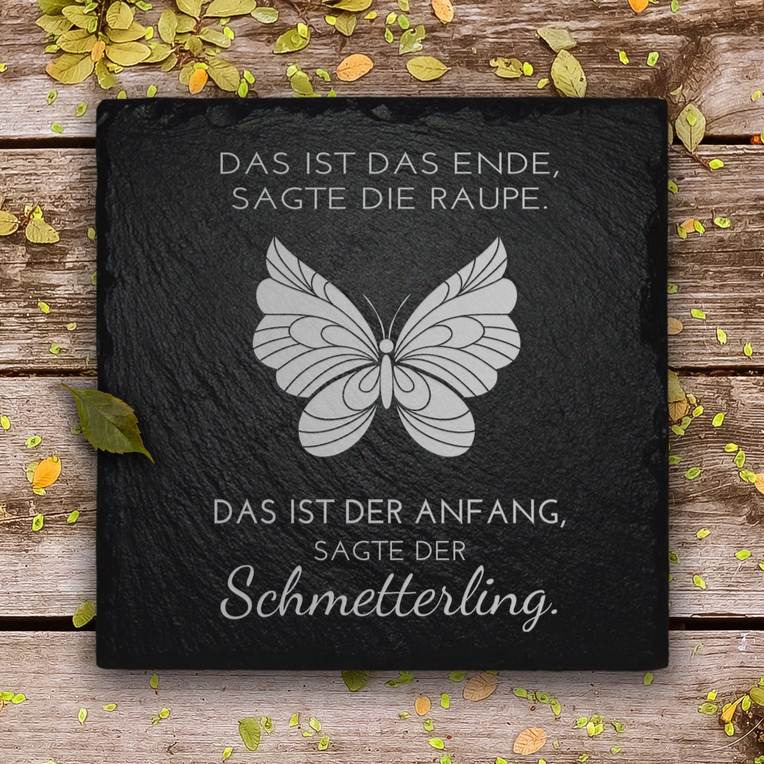 Grabschmuck aus Schiefer mit Schmetterling Gravur und tröstlichem Text.